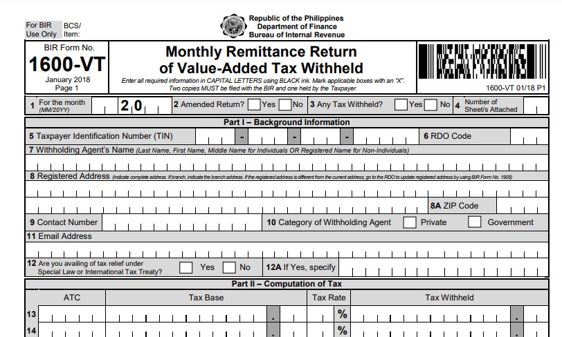 BIR Form 1600VT