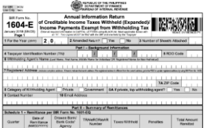 Form 1604E is the Annual Information Return of Creditable Withholding Taxes (Expanded). It summarizes all expanded withholding taxes you withheld and remitted during the year. This form must be filed on or before March 1 of the following year.