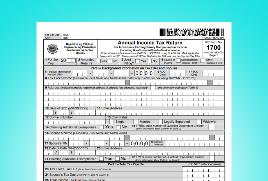 The BIR Form 1700 (Annual Income Tax for Individuals Earning Purely Compensation Income) is an Income Tax form required from employed individuals who had multiple employers within the same taxable year. The BIR mandates this return to be filed from every resident, resident aliens, and non-resident aliens earning compensation income (ex. salary, commissions) from the Philippines.
